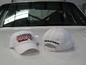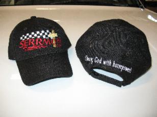 "Chasing God with horsepower !" embroidered on the back of each hat.